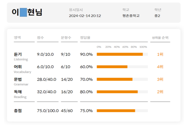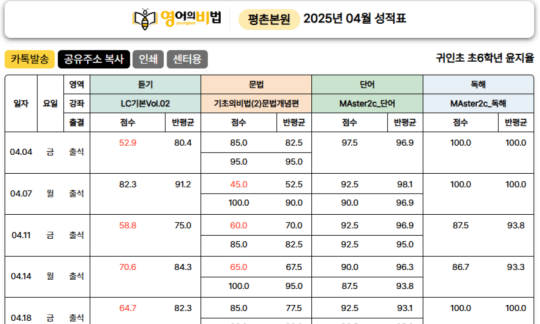 Daily TEST의 결과는 수업 종료 5분 후에 학부모님의 카톡으로 성적표 전송